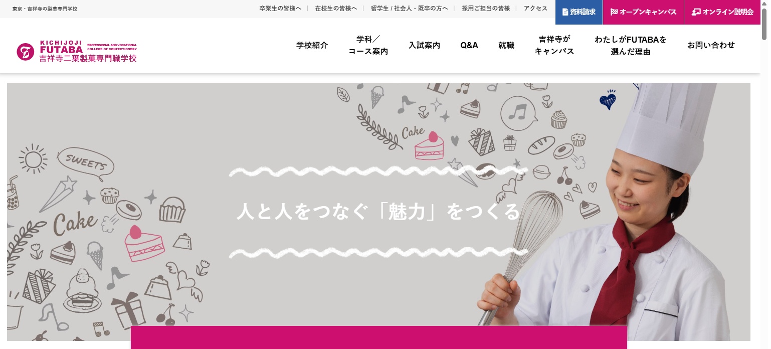 東京・吉祥寺駅から徒歩6分。吉祥寺二葉製菓専門職学校。世界基準の講師陣。洋菓子とパンづくりのプロを目指す。世界の技と技術を持つ、世界から認められた二葉製菓学校の講師があなたの夢を実現させます。(姉妹校:吉祥二葉栄養調理専門職学校) https://futaba-sogo.ac.jp/confectionery/