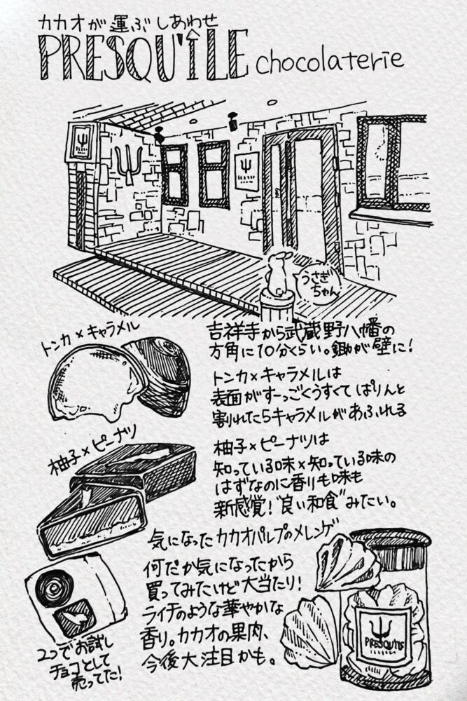 チョコレート、お好きですか? 私はチョコレート、甘すぎるのはあんまり得意ではないけれどとっても好きです。普段はカカオ分が多いものを好んで食べているのだけれど、毎年2月はバレンタインをいいことにいろんなショコラトリーのちょっと良いチョコを買っては食べをしています。職人技を味わうのが楽しくて、あれやこれやと食べているのですが、その中でも武蔵野八幡に程近い「プレスキル ショコラトリー」さんのボンボンショコラは私の中でナンバーワン。サロンデュショコラに出展されていたり関西の百貨店の催事に出られていたりと、全国的にも有名なショコラトリーさんです。