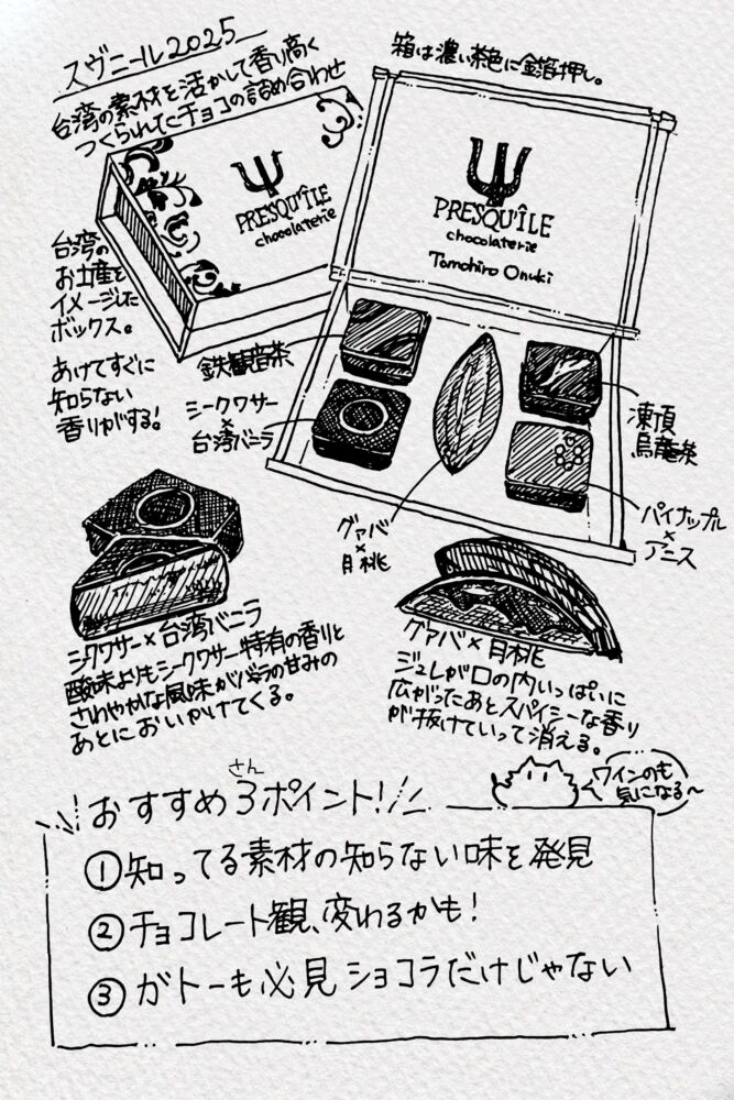 それぞれ鉄観音茶、シークワーサ×台湾バニラ、凍頂烏龍茶、パイナップル×アニス、グァバ×月桃。どれも台湾の素材がぎゅっとひとくちのチョコに詰め込まれているようです。