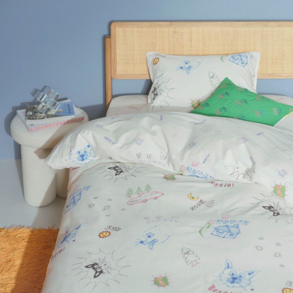 さらっとしたコットン素材100%のベッドリネン。カラフルな柄ながら、白を基調としているため、お部屋にも馴染みやすいのがポイントです。