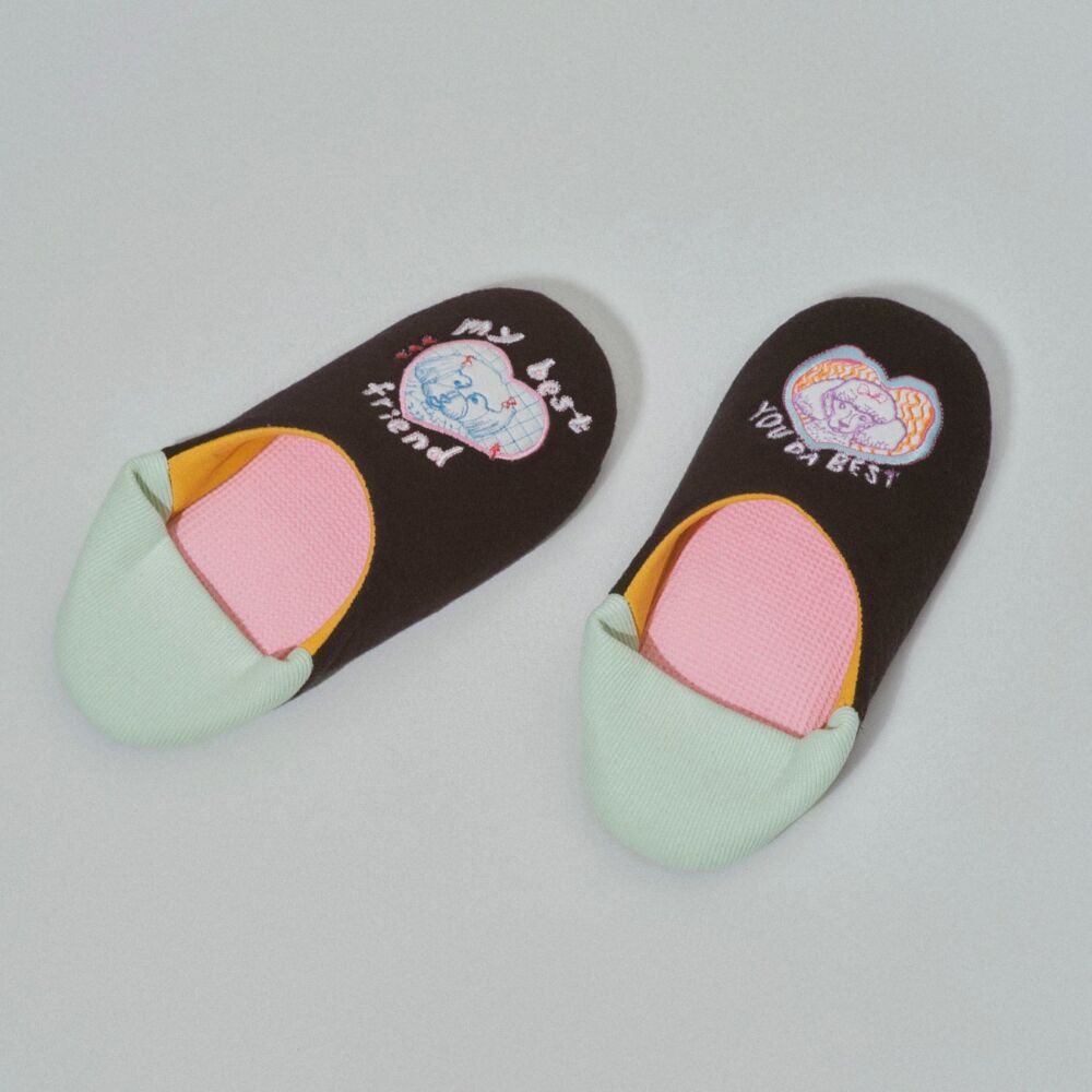 ストリート感のあるポップなイラストを、ワッペンのように刺繍に落とし込んだバブーシュ。カラフルな色とキュートな犬たちが、暮らしを足元から明るくしてくれます。全2色展開。