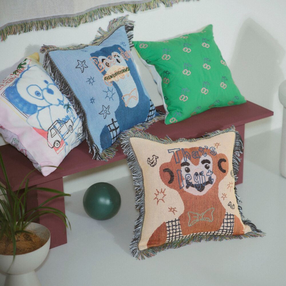 ユニークなキャラクターを描いたクッションカバー。お部屋のアクセントになるアイテムです。ゴブラン織りやキルト素材などデザインは全4種類。