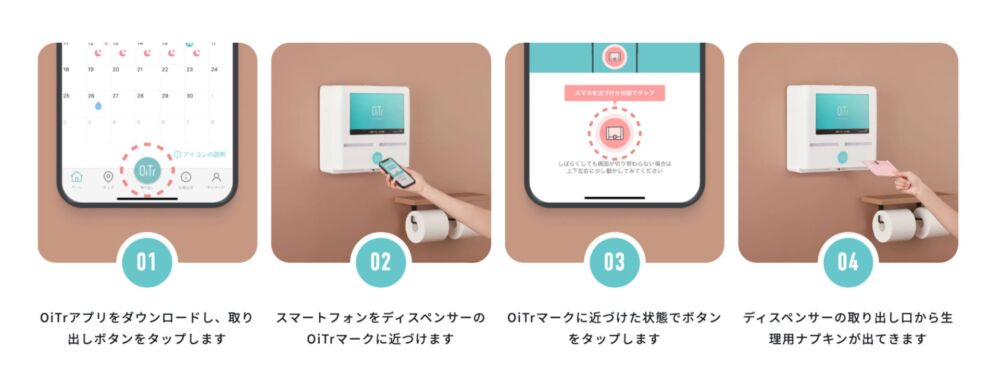 OiTrは、全国の商業施設や交通機関、公共施設、オフィス、学校などの女性個室トイレに生理用ナプキンを常備・無料提供する日本初のサービスです。専用アプリ(無料)をダウンロードし、ユーザー登録することで、2時間ごとに1枚、25日間で最大7枚の生理用ナプキンを無料で受け取ることができます。