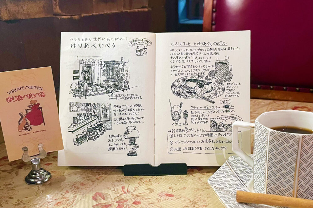 吉祥寺で時間がゆっくり流れる空間はいくつかあるけれど、レトロでクラシカル、可愛らしいけどちょっと退廃的、そんなお店。外から見ると出窓と、彫刻が施された木の扉、たくさんの植物。そして「ゆりあぺむぺる」の文字。周りのお店とはちょっと違う、ここだけ少し昔のヨーロッパのような雰囲気です。木の少しだけ重いドアを開けると、中はほんのり暗くて、コーヒーのいい香り。2階もあるのだけれど、タイミングなのかいつもなぜか1階に案内してもらいます。可愛らしいくらげのようなランプが柔らかい光を放って、空間ごとふんわりとした温かい光で満たされています。