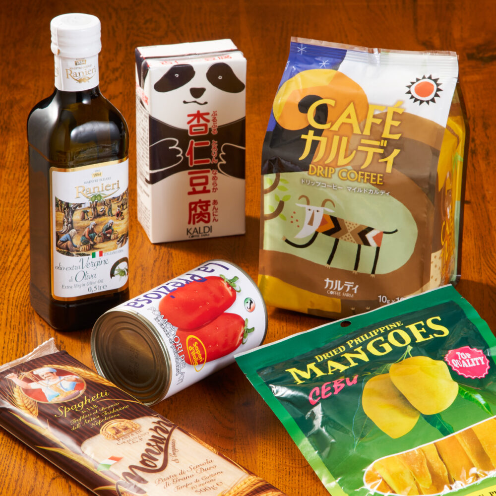 こだわりのオリジナルコーヒー豆30種をはじめ、見ているだけで楽しくなるような世界各国の珍しい食材やお菓子、ワイン、チーズ、スパイスなどが所狭しと並びます。