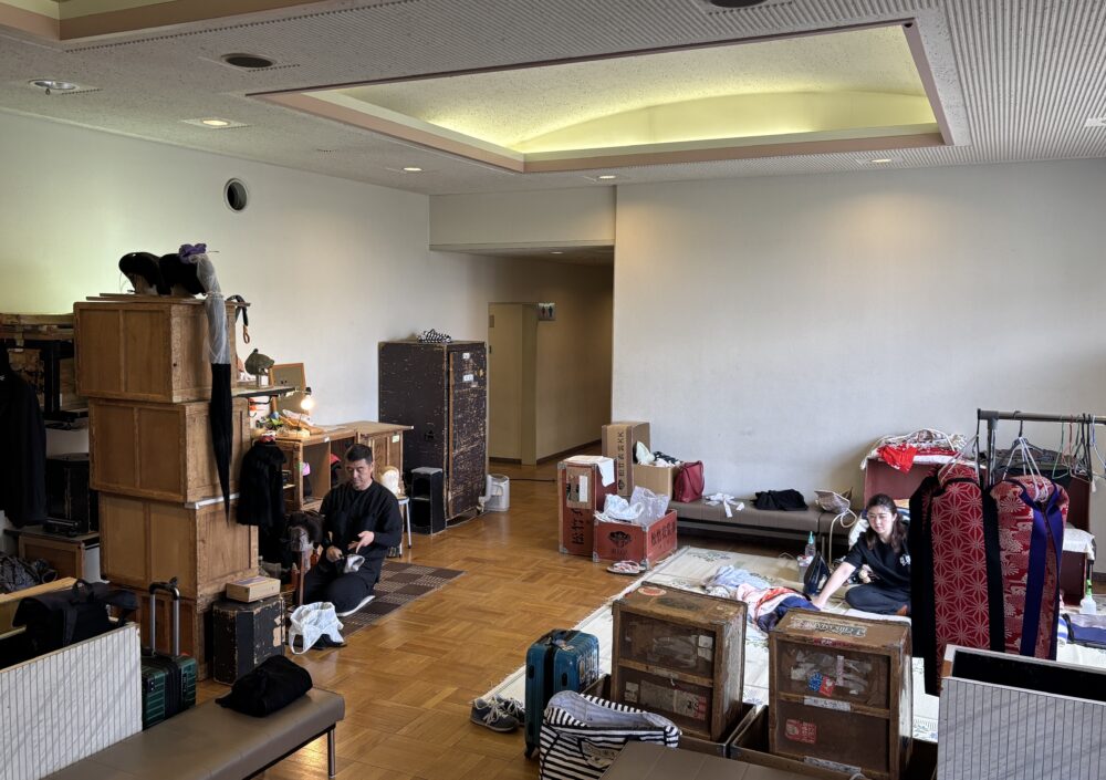 前進座では歌舞伎や時代劇を行うことが多いので、その際に出演者・スタッフ控室以外に必ず必要となるのが、床山部屋と衣裳部屋だ。しかし、劇場によって楽屋の数は異なり、個室もあれば大部屋もある。場合によっては楽屋が足りないこともあり、そんな時はリハーサル室やロビーの待合、楽屋廊下や奈落(舞台や花道の地下)までもが役者の楽屋や、床山・衣裳部屋となることもある。舞台終了後には感謝の気持ちも込めて掃除を行い綺麗に元通りにして劇場を後にします。