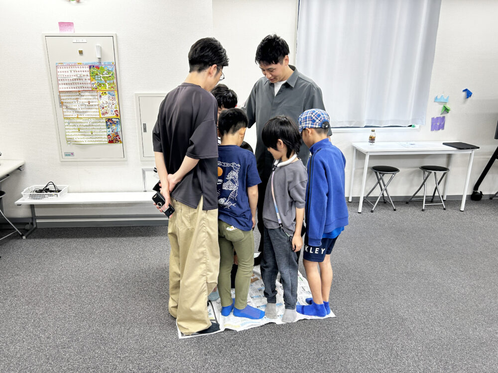 できあがったら、みんなでその上に立って体感! 体感的に「面積」を身につけることができます。