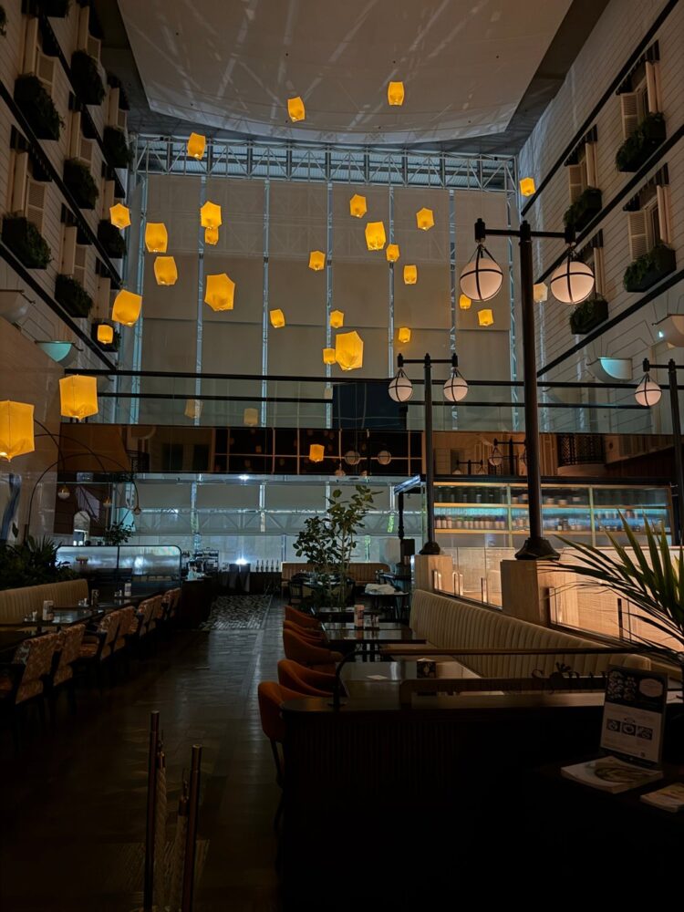 ラウンジ&ダイニングSORAEは、天井高約15メートルの開放的なアトリウム空間が特徴のレストラン。この空間を活かし、七夕の季節に“願い”を空に届ける、幻想的なひとときが演出されます。