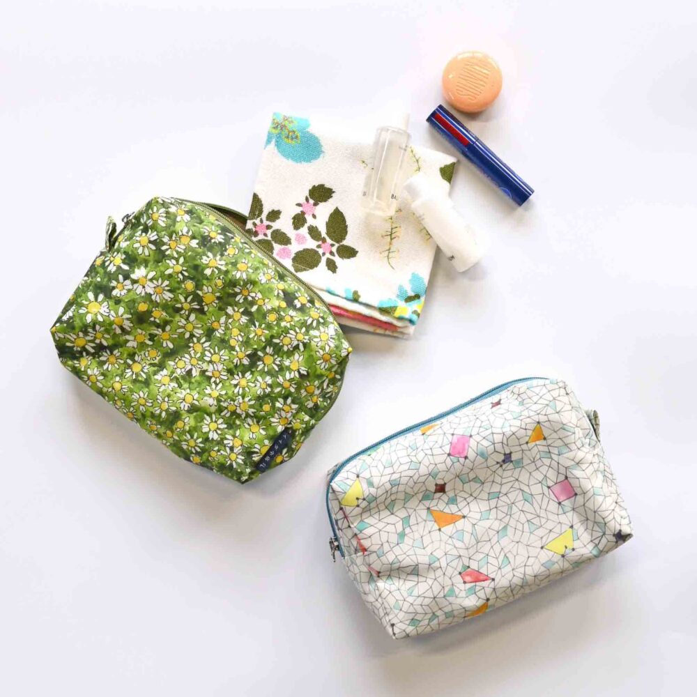 傘以外にも、傘の生地をつかった防水のポーチやバッグ、テキスタイル柄を落とし込んだタオルなどの取扱いがあります。イイダ傘店のテキスタイルを天気関係なく持ち歩けるのは、なんだかお得な気分になってしまいます♫