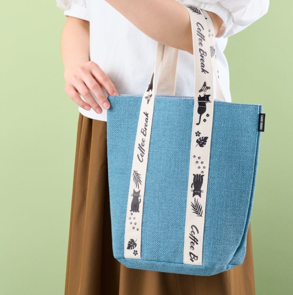 「黒ねこリネン風バッグ」は、夏らしいナチュラルな風合いの素材を使用した、日常使いにぴったりなアースカラーのバッグです。カラーバリエーションは、夏らしいキウイブラウン、優しい色合いのオーシャンブルー、そしてシックで落ち着いた印象のシャノアールブラックの3色展開。ハンドル部分には、夏休みを満喫中の黒ねこがヤシの木の陰でひと休みしている、癒しのワンシーンがデザインされています。さらに、ブラウンにはマスタードイエロー、ブルーにはホワイト、ブラックにはグレーを組み合わせ、ハンドルの柄や色の切り替えが、遊び心あるキュートなアクセントになっています。バッグの内側には、スマートフォンなどが収納できる便利なポケット付き。コンパクトながらマチがしっかりあるため、お買い物やランチタイムの外出はもちろん、ちょっとしたピクニックなど、夏のおともにぴったりのバッグです。