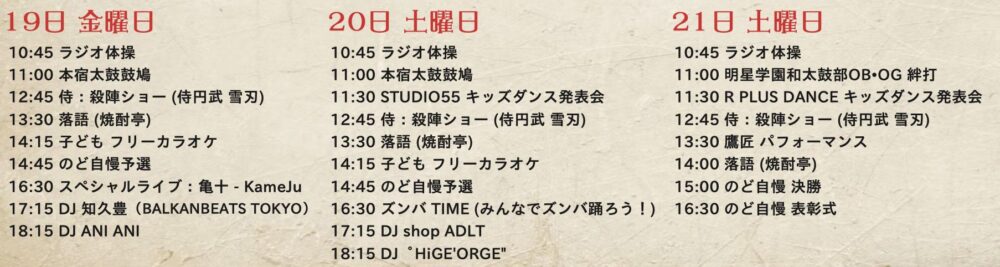 大江戸寄席小屋 by 焼酎亭【3日間】、侍:殺陣ショー(侍円武 雪刃)【3日間】、スペシャルライブ「KameJu and Sounds」【7/19】、ズンバ TIME(みんなでズンバ踊ろう!)【7/20】、鷹匠体験の鷹の庵【7/21】