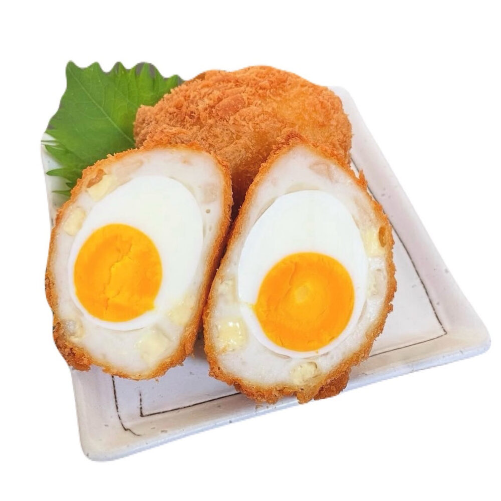 食べ歩きフードとしても人気の「吉祥寺揚げ」。マヨネーズと刻み玉ねぎを練り込んだすり身で、ゆで卵を丸ごとひとつ包んだ贅沢な一品。まるでタルタルソースのようなコクのある味わいが特徴です。