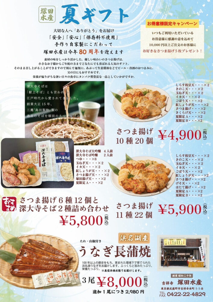 吉祥寺散策の合間に、またはお中元や贈り物として。塚田水産のこだわりの味を、楽しんでみてくださいね。