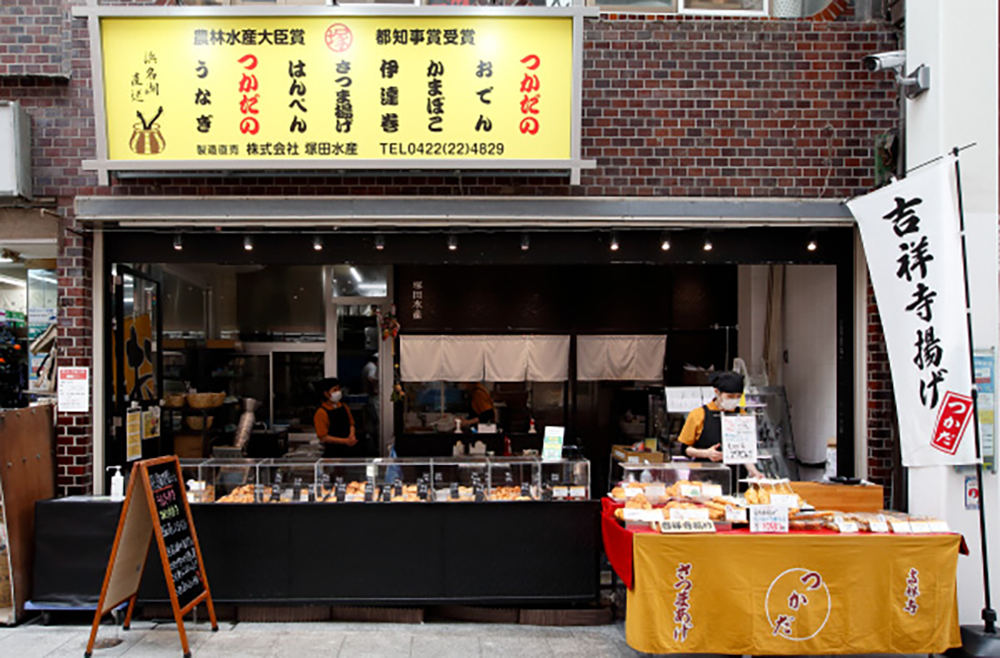 吉祥寺駅北口から徒歩1分、ダイヤ街に店を構える創業80年の老舗「塚田水産」。思わず足を止めたくなる店先には、職人が丁寧に揚げた「塚田揚げ」や「野菜天」、むさしのプレミアムにも選ばれた「吉祥寺揚げ」など、人気の自家製さつま揚げやおでん種がずらりと並びます。