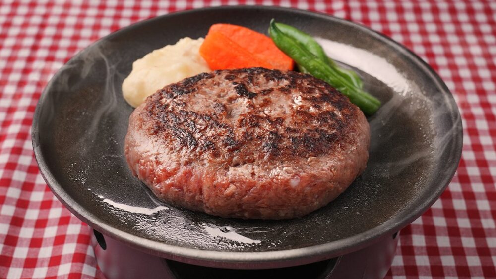 「とろけるハンバーグ」は、小麦粉・卵・乳製品などの“つなぎ”を一切使わず、国産牛と黒毛和牛を独自に配合してつくられた、肉本来の旨味を極限まで引き出したハンバーグです。