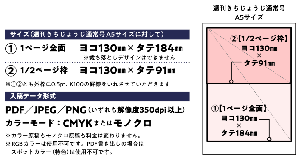1/2: ヨコ130mm ✕ タテ91mm ※全面、1/2ページとも外枠に0.5pt、K100の罫線をいれさせていただきます