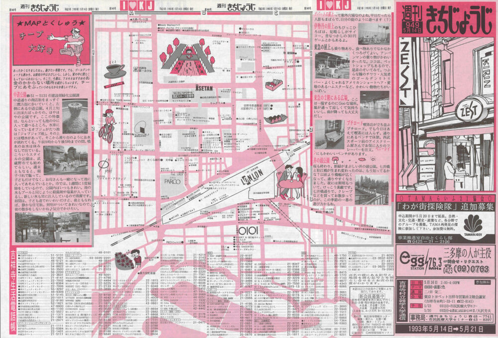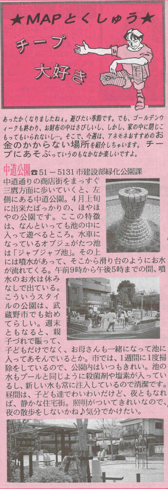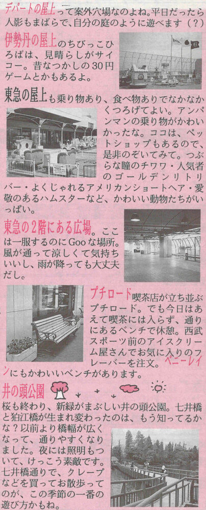 特集は「チープ大好き」。ゴールデンウィーク明け、読者のお財布事情(?)を考慮して吉祥寺で無料で楽しめるスポットを紹介していました。取り上げられていたのは「中道公園」、「デパートの屋上」、「プチロード」、そして今も昔も人気の「井の頭公園」!