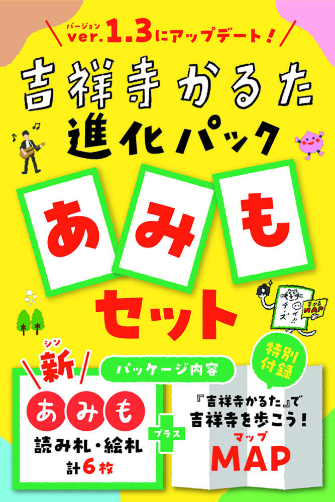新バージョンの発売にあわせ、既存ユーザー向けに「進化パック」も登場。「あ」「み」「も」の新しい札と読み札に加え、特別付録として『吉祥寺かるた』で紹介されたスポットを描いたイラストマップ【吉祥寺を歩こう!MAP】が同梱されています。街歩きのお供としても楽しめるセットです。