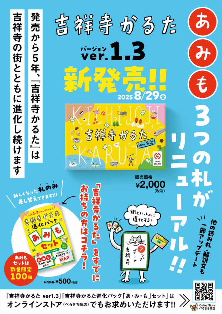 吉祥寺の街を題材にした人気のご当地かるた『吉祥寺かるた』が、3回目の進化を遂げた新バージョン「ver.1.3」として2025年8月29日(金)に発売されます。今回は「あ」「み」「も」の3枚の札をリニューアル。街の“今”を映した最新の吉祥寺を楽しめる内容になっています。