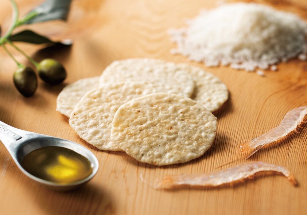 オリーブオイルとほのかな酸味をプラスして洋仕立てに仕上げた薄焼きのしろえびせんべいです。