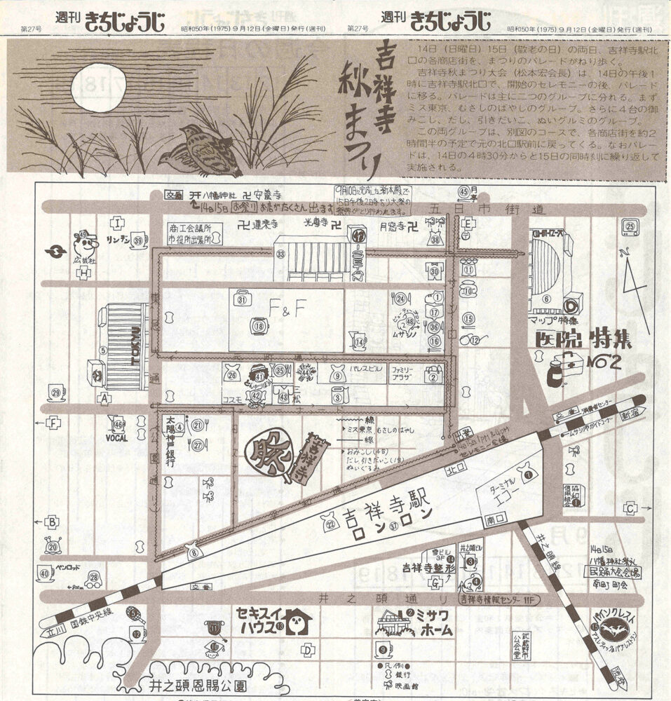 [大会本部]祥南会(南口商店会・パークロード商店会) [主催]吉祥寺秋まつり実行委員会 [後援]武蔵野商工会議所/武蔵野市商店会連合会/武蔵野市開発公社 [協力]むさしのばやし保存会/北多摩睦消防組一区一番組/花柳伊千兵衛と吉祥寺太鼓同好会