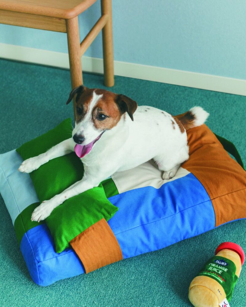 パッチワークで色を切り替えた、ポップなデザインのペットベッド。カラーはグリーンとアイボリーの2色展開。