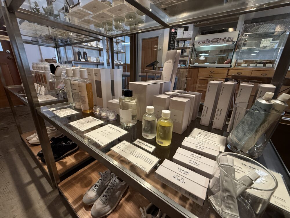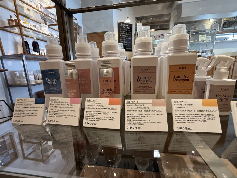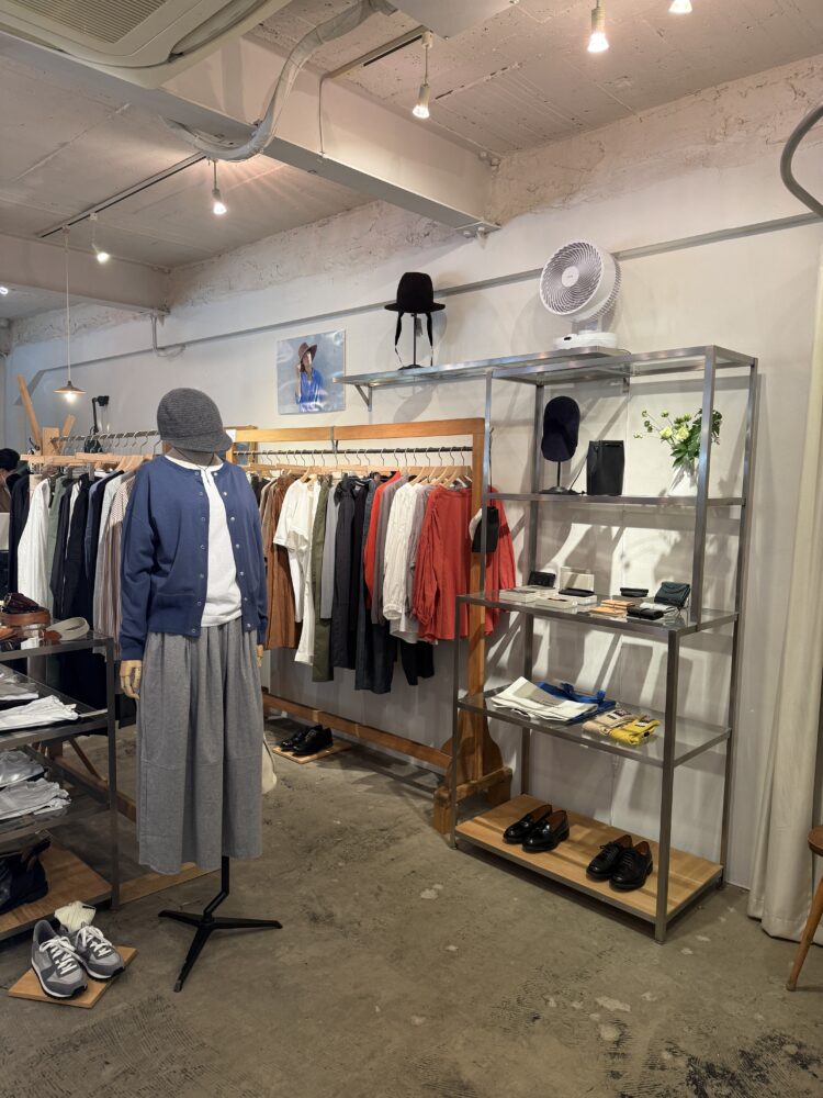 アパレルスペースには、中臣さんがデザインするHouttuynia cordata(ホーチュニアコダータ)のシャツや、セレクトした洋服、小物などのグッズに加え、キャンドルや、服のお手入れには欠かせない洗剤などが並びます。