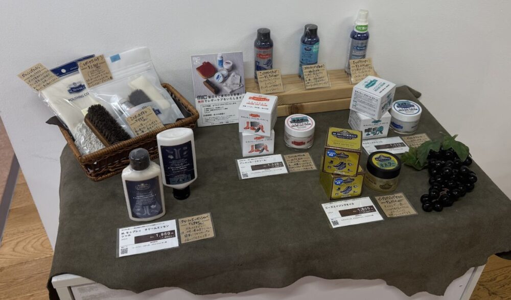 革はもともと“生きていた皮膚”。定期的なケアが使い心地と寿命を大きく左右します。micの店頭では、購入製品のレザーケアを無償でおこなっており、講習を受けたスタッフが対応してくれます。