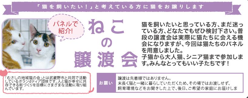 猫を飼ってみたい方も、まだちょっと迷っている方も、気軽に立ち寄れるパネル展です。いつもの譲渡会では実際に猫たちに会えますが、マーケットでは写真パネルでご紹介。子猫から大人猫、シニア猫まで、みんなとってもかわいい子たちばかりです!
