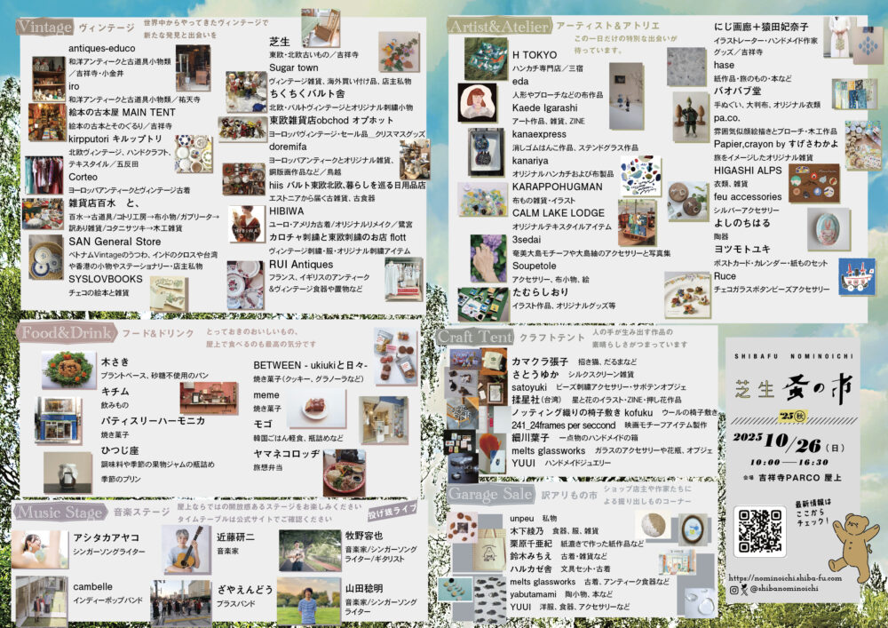 2025年10月26日(日)に4回目を迎える「芝生蚤の市」。今回は「ヴィンテージ」「アーティスト・アトリエ」「クラフトテント」「フード・ドリンク」「訳アリもの市」の5つのエリアに、全61組が集まります。
