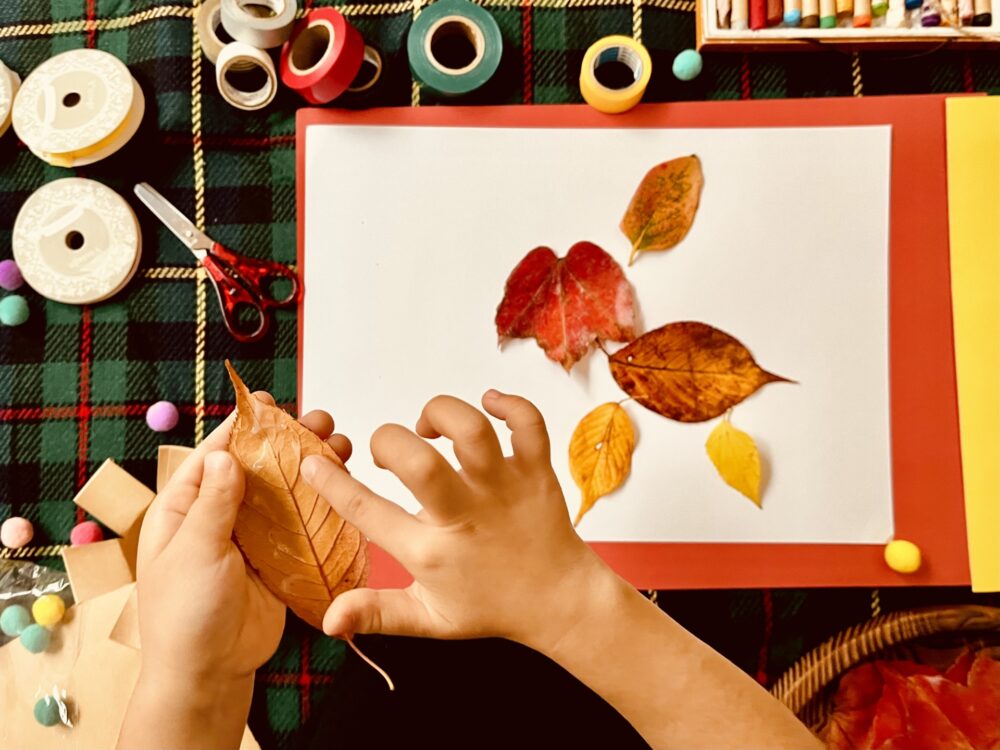 畑から集めた野菜の葉っぱを画用紙に貼って絵をつくるワークショップ。参加費無料。