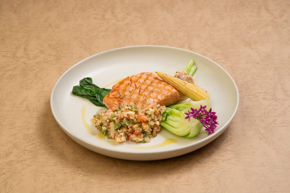 脂の乗ったサーモンをグリルし、余分な脂を落としつつ美味しさをキープ。食べる野菜のタルタルでさっぱりと!