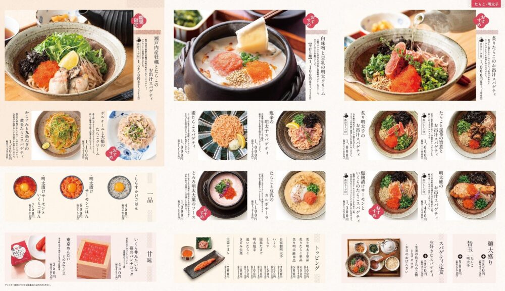 「東京たらこスパゲティ」は、頑張る女性を応援したいという想いで誕生しました。女性ひとりでも利用しやすい明るく清潔感のある空間で、親しみのある身近な「たらこスパゲティ」を今までにない提供スタイルと専門店ならではのこだわりによって磨かれた進化系たらこスパゲティとして提供します。