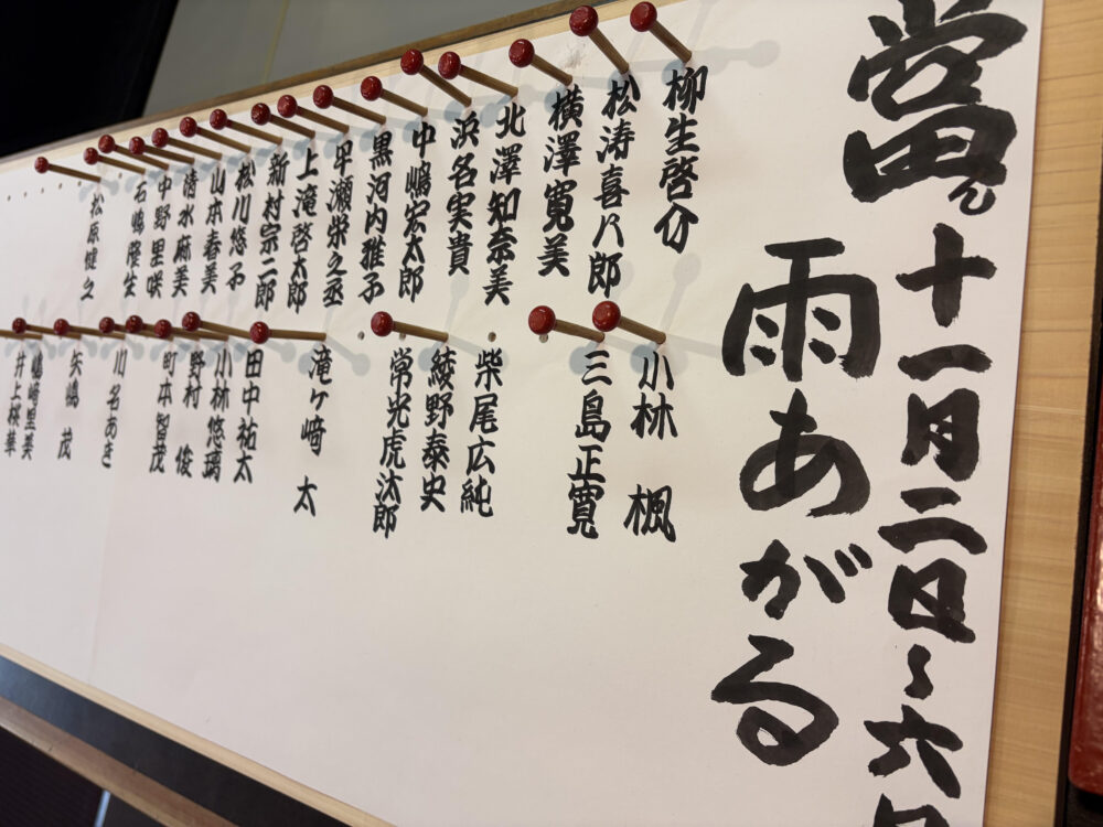 楽屋の入り口で目に入るのが、出演俳優の名前が記された着到板です。名前の上部には穴があいており、俳優や裏方が楽屋入りすると竹でできた釘を穴に挿します。これがささっていると「もう楽屋入りしているな」と一目瞭然。いわゆる出欠簿のようなものです。