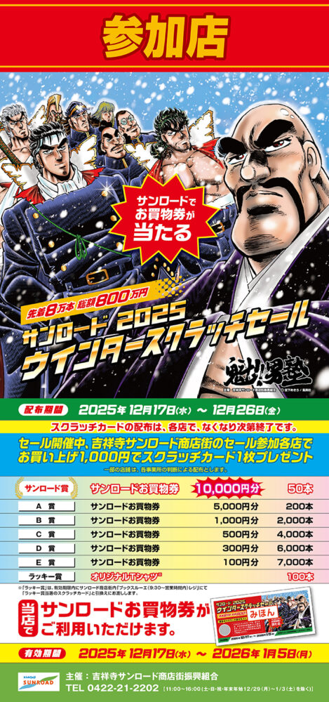 夏のセールに引き続き、今回もメインビジュアルは、漫画家・宮下あきら先生の『魁!!男塾』。セール期間中は、「参加店ポスター」が掲示されているお店で1,000円のお買い上げごとにスクラッチカードが1枚プレゼントされます1。スクラッチして、当たった金額がお買い物券として使えちゃいます!