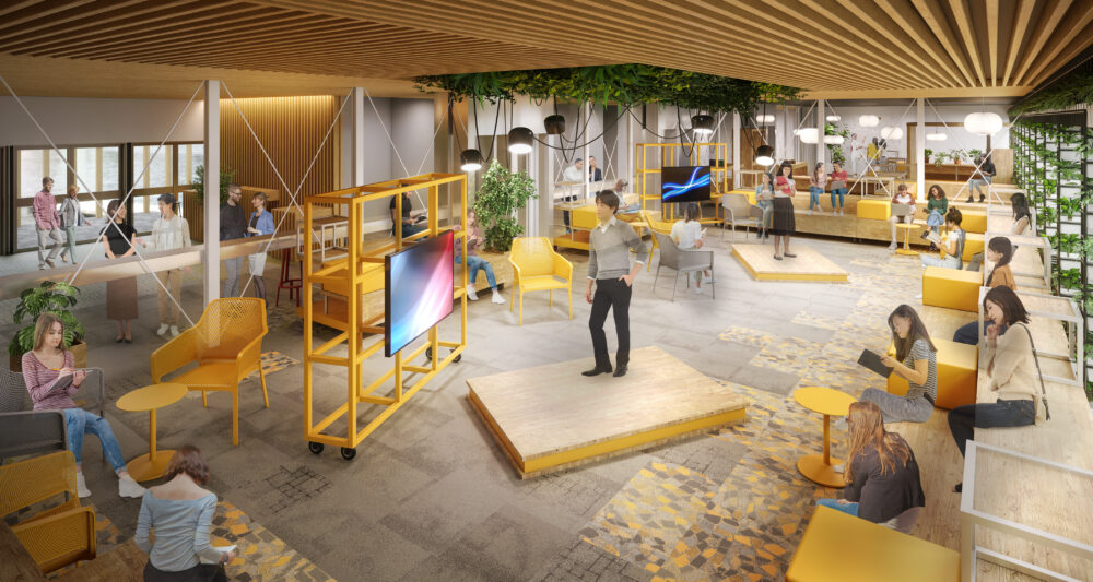 従来の「教室」という概念にとらわれない、社会とつながるための実践的なゾーンが設置されています。