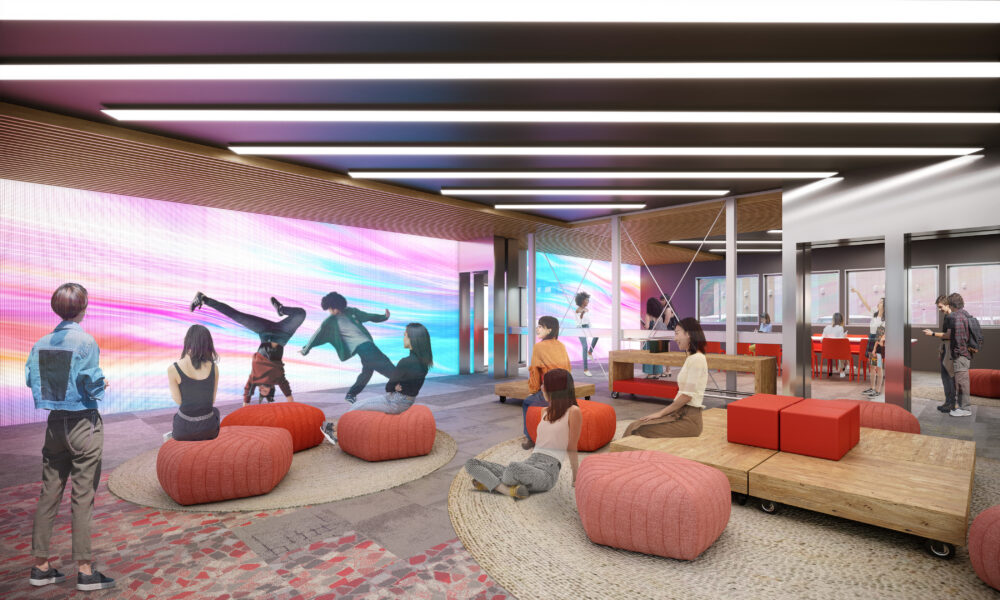 壁一面に大型LEDビジョンを配した、プロ仕様のクリエイティブスタジオです。ダンスや演劇のパフォーマンス、映像制作、オンライン配信など、デジタルデバイスを駆使した表現活動が可能。保護者向け説明会や産学連携イベントなど、社会に向けたアウトプットの場としても機能します。