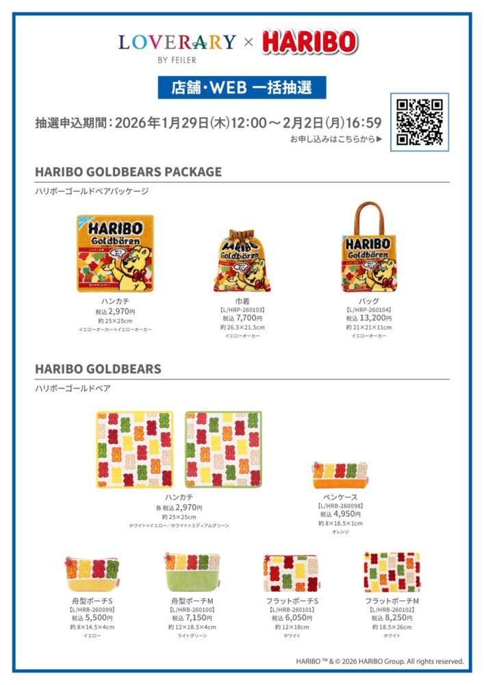 2026年1月29日(木)12:00~2月2日(月)16:59の期間、ドイツ生まれの世界的なグミキャンディブランド「HARIBO(ハリボー)」とドイツ伝統工芸織物シュニール織のブランド「FEILER(フェイラー)」のギフトコンセプトショップ「LOVERARY BY FEILER(ラブラリー バイ フェイラー)」が初コラボレーションした商品を、ラブラリー バイ フェイラーショップ( https://www.feiler-jp.com/loverary/ )、フェイラー公式オンラインショップ( https://feiler.jp/ )一括抽選にて発売します。