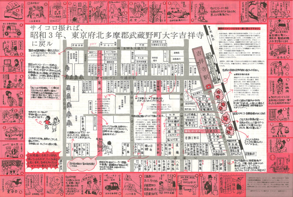 なかでも目を引くのが、「サイコロ振れば、昭和3年、東京府北多摩郡武蔵野町大字吉祥寺に戻ル」と題した、すごろくマップです。