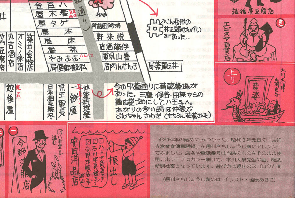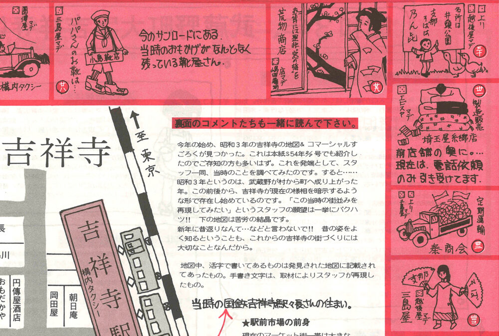 よ〜く読んでみると、『昭和54年の始めにみつかった、昭和3年元旦の「吉祥寺営業宣傳壽語録」を週刊きちじょうじ風にアレンジしてみました』とあります。さらに、『昭和3年というのは、武蔵野が村から町へ成り上がった年。』とも。店名などは昭和3年(1928年)当時のものがそのまま使われているそうで、1928年のすごろくと、その頃の地図を元に2つを組み合わせてアレンジし、コメントを加えた企画だったのです!1『「この当時の街並みを再現してみたい」というスタッフの願望は一挙にバクハツ!! 下の地図は苦労の結晶です。』とあるように、相当気合いの入った特集だったんですね。