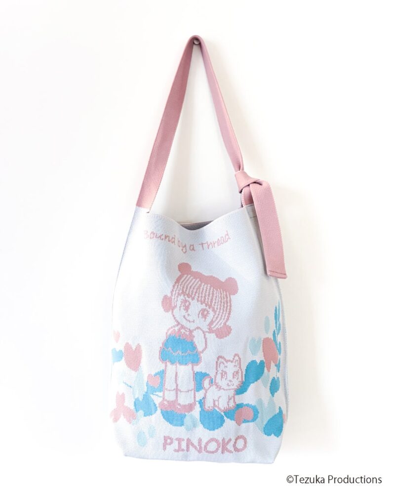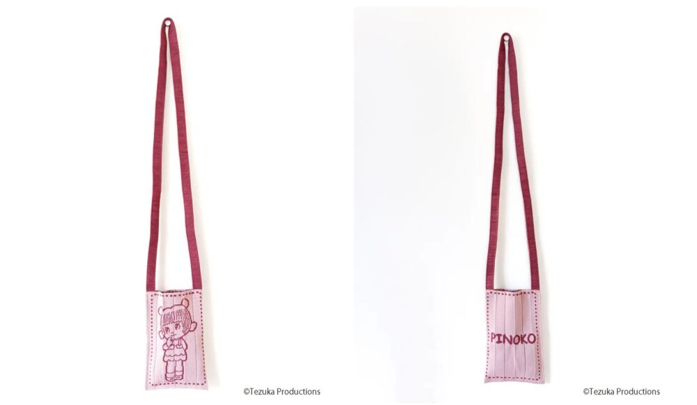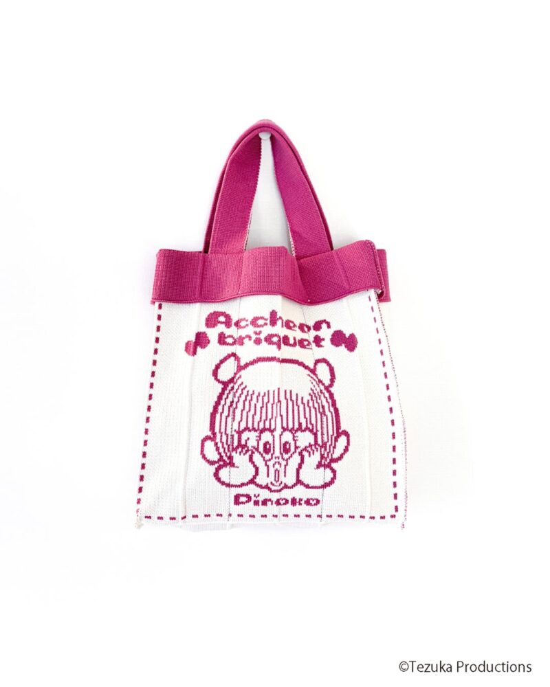 「アッチョンブリケ」は、ピノコが怒ったときや驚いたとき、感動したときなどに口にする言葉で、彼女を象徴する特徴的なフレーズのひとつです。ピンクとの相性も良く、持つだけで目を惹くデザインになっており、「Co-Knitty」は小ぶりなサイズ感ながらマチ付きで、見た目以上の収納力を備えた、機能性にも優れた作品です。