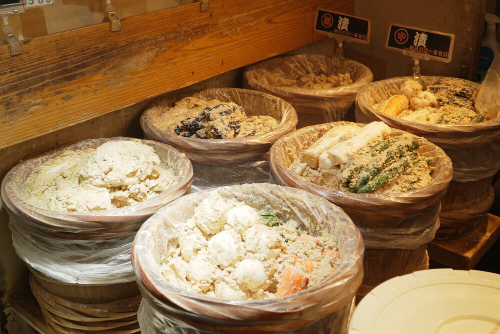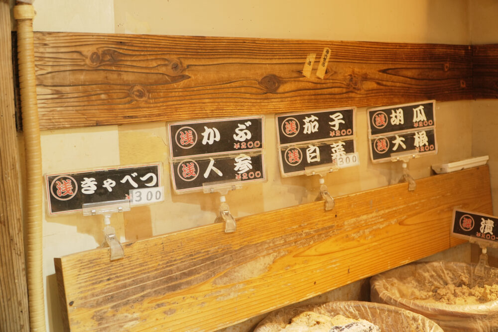 「昔はからし菜や高菜みたいな葉物も多かったんだけど、漬物用の野菜を作る生産者さんが減ってきてね」と清水さん。そんな清水屋でおすすめなのが、3種類のぬか漬け。「浅漬け」「中間」「深漬け」と、漬かり具合の違う3つのぬか漬けが並びます。