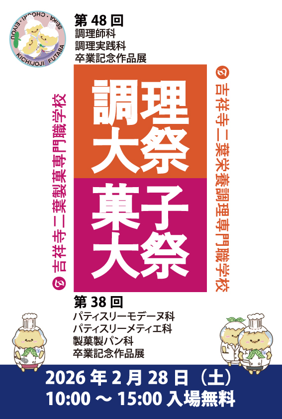 さて、2026年2月28日(土)には吉祥寺二葉栄養調理専門職学校の「調理大祭」と吉祥寺二葉製菓専門職学校が「菓子大祭」が開催されます。学生たちの学びの成果を多くの人に披露する卒業・進級作品展イベントです。在校生がこれまで学んだ技術・創意を活かした作品(料理・お菓子)を展示・販売・提供する、大きな行事となっています。地域の方も参加できるので、ぜひ学生たちの作品を楽しんでみてくださいね。