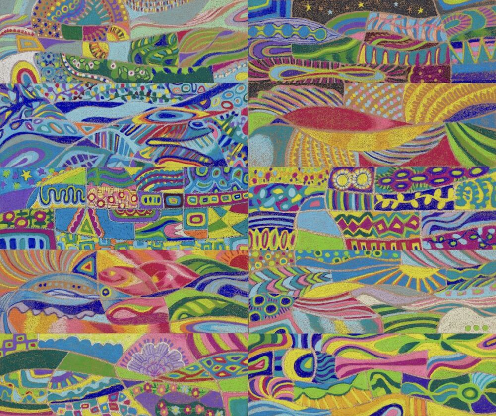 幼少期からものづくりが好きで、絵を描いたり、人形の服の制作をしていた。 9歳の時、家族と共にユーラシア大陸を列車で横断した経験は、彼女の創作活動に大きな影響を与えた。 2015年頃、臨床美術の教材で紙やすりに色鉛筆で描く技法と出会い、そのざらついた描き心地と独特の質感に魅了される。 以降、自身の表現のひとつとして取り入れ、音楽のリズムや感情の高まりに導かれながら、鮮やかで直感的な色彩を生み出すようになった。 本作品「つながる風景」は、6×18cm の紙やすりに描かれた作品を10枚並べたもので、 それぞれには友人のイメージや音楽から受けた影響が込められている。
