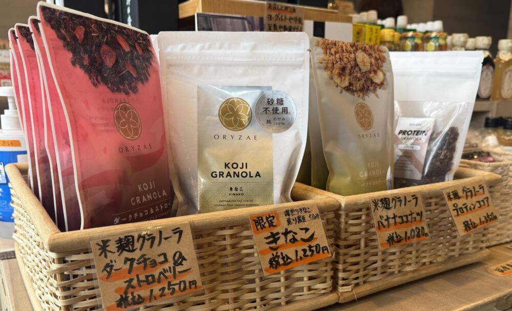 店舗に並ぶ商品はいずれも発酵食品をベースにしているこころダイニング。代表の茶谷さんは「発酵の力で素材の旨みを引き出し、体にもやさしい味わいを大切にしています。中でも一番人気は『サクサクしょうゆアーモンド』。香ばしいアーモンドとしょうゆの旨みが絶妙に調和した商品です。そのほか、『糀入りもちもち玄米』や『甘糀入りにんじん』も人気で、どれも発酵の魅力を日常の食卓で楽しんでいただけるようにしています」と教えてくれました。