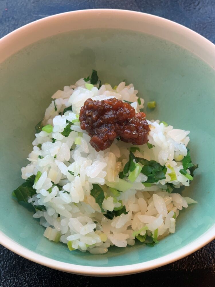 ご飯と混ぜ合わせるだけ。茶わんに盛り、しょうゆの実をのせるだけで完成。発酵の旨味と三つ葉の香りが春らしい一品です。