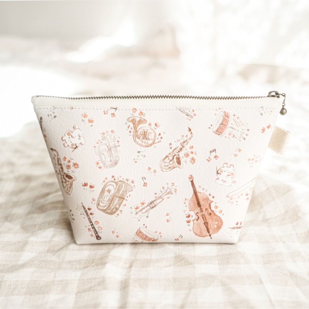 水彩風の楽器とお花、ワンポイントのうさぎが可愛い人気シリーズ。イラストレーターmomochyの吹奏楽とオーケストラの経験を活かし、チューナーが入るサイズの「三角ポーチ」など、楽器練習にもぴったりなグッズのラインナップも魅力です。