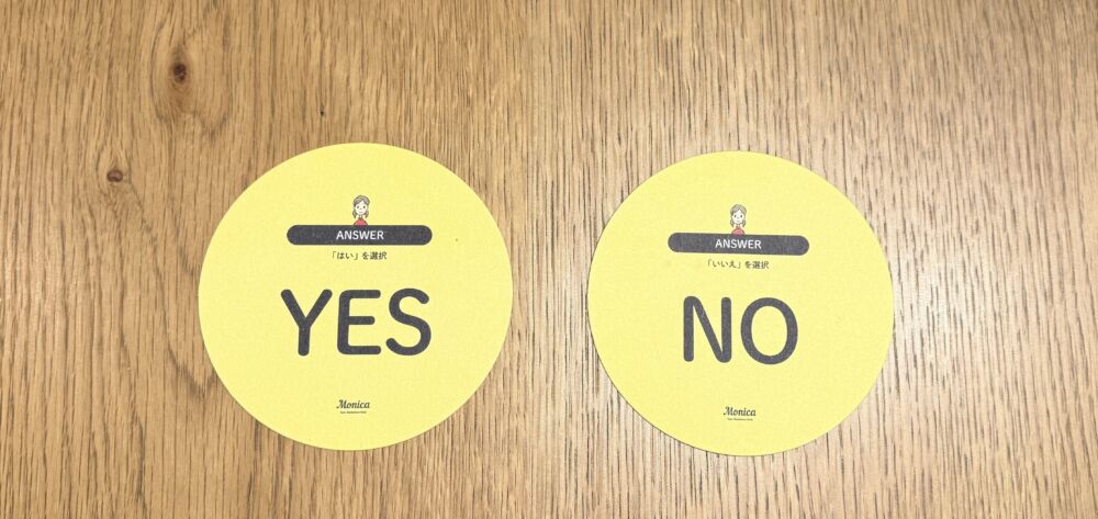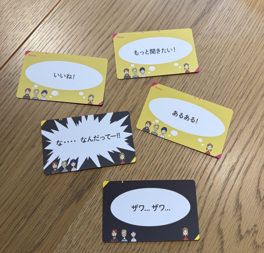 参加者が順番にカードをめくって、めくった人がYESかNOで答える。その理由を説明して、ほかの参加者もリアクションカードを提示する。めくってない人も自分の意見を発表してOK。
