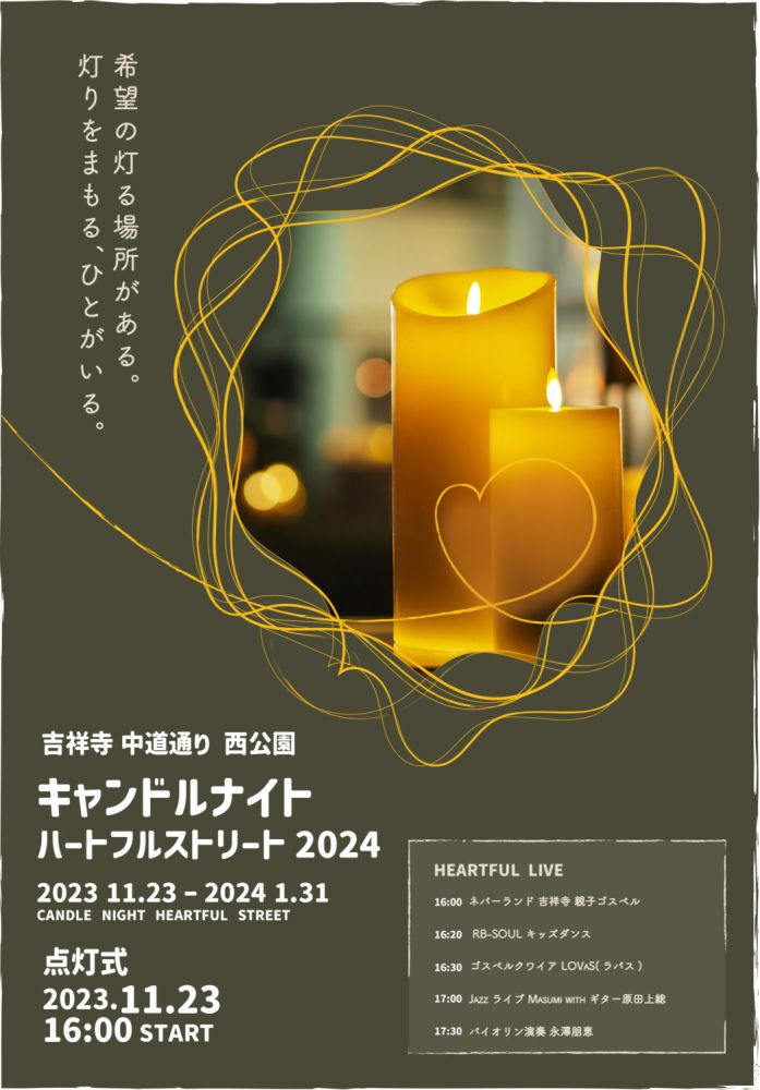 Kichijoji Candle Night 2023 開催日 2023年11月23日(木・祝) 〜 2024年1月31日(水) 会場 吉祥寺駅周辺東京都武蔵野市吉祥寺南町 Web https://www.coppice.jp/newsandevent/coppice/15618/