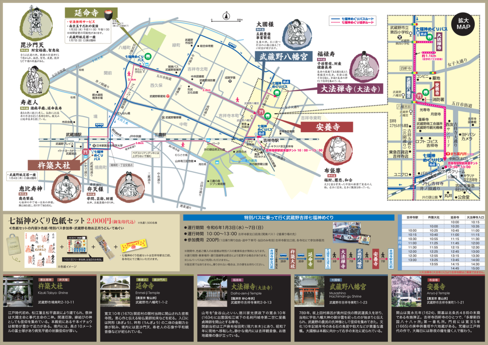 「特別バスに乗っていく武蔵野吉祥七福神めぐり」 運行日時:2024年1月3日(水)~7日(日) 運行時間:10:00~ 13:00 参加費:200円(1日乗り降り自由・途中下車可・当日のみ有効) ※期間中、七福神めぐり色紙セット購入の方は特別バスの乗車料金無料 購入場所:吉祥寺駅北口前(駅前本部)、各神社にて販売
